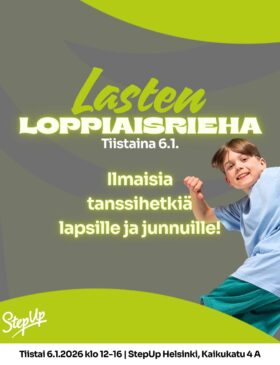 Tervetuloa viettämään Lasten loppiaisriehaa tiistaina 6.1. StepUp Helsinkiin, Kaikukadulle klo 12.00-16.00! Loppiaisriehassa voit testata lasten ja junnujen tanssitunteja ilmaisilla kokeilutunneilla.…