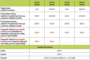 For a student who buys multiple seasonal tickets, we grant a personal seasonal ticket discount: the first seasonal ticket of the season is full price and you get a 15% discount on other seasonal tickets of the same season, regardless of when the seasonal tickets are purchased. The seasonal ticket covers one chosen class until the end of the season and can only be purchased after registration. The seasonal ticket cannot be transferred from one class to another, so only buy the seasonal ticket after you have tried the class (e.g. with a single ticket) and know that you can commit to the class for the rest of the season. You can also confirm your registration with a single ticket. A student who has a seasonal ticket does not have to report absences from the seasonal ticket classes, the place remains reserved despite the absences.